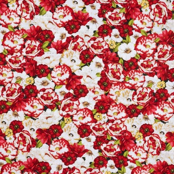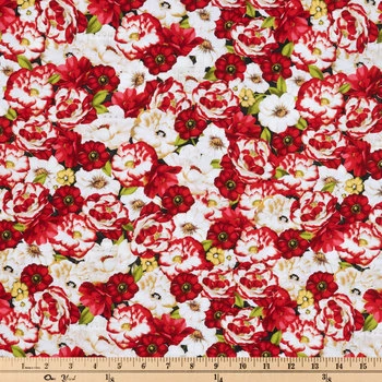 Amazing Grace Floral Cotton Calico Fabric has a smooth, even surface with a red and white floral pattern. The flowers occasionally give way to bars of musical notation that hint at the melody of “Amazing Grace,”Β a classic hymn.