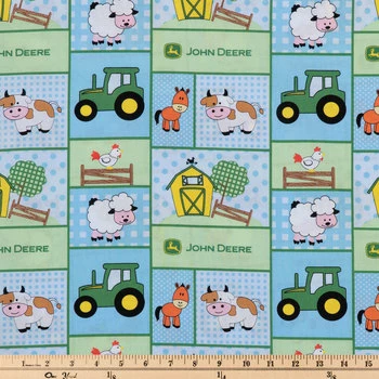 Decorate your little farmer’s room in the most adorable fashions–and take him out on the town in style! Baby John Deer Cotton Calico Fabric features a light blue-patterned and light green block patch design with cows, sheep, horses, chickens, barns, and tractors. Use it to make the cutest quilts, pillows, curtains, apparel, and nursery accents!