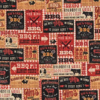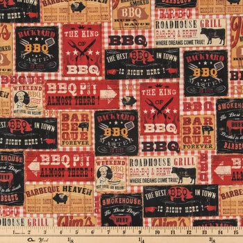 Create stylish accents for your next cookout with Barbecue Patch Cotton Calico Fabric! This fun fabric features red gingham and distressed signs in red, black, and tan. It is designed with images of pigs, cows, grilling utensils, hot dots, stars, and more had has distressed text in coordinating colors. It is the perfect choice for creating themed quilts, placemats, aprons, and table covers.
