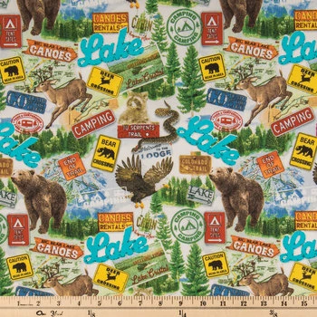 Give your sewing projects a unique look with the addition of colorful, collaged fabrics. Bears & Canoes Cotton Calico Fabric features am off-white background printed with imagery from the great outdoors such as bears, deer, trail signs, and more. It’s perfect for making camping or adventure-themed quilts, pillow covers, valances, and so much more!