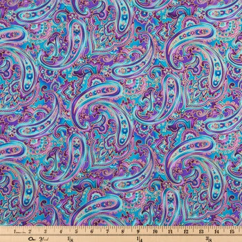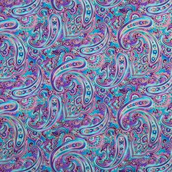 Create stunning sewing and craft projects with Blue Paisley Cotton Calico Fabric. This gorgeous fabric features an elegant pattern of paisleys and florals in shades of dark purple and blues. The shapes are outlined with metallic gold for a hint of shimmer and added dimension. Use it to make quality quilts, pillows, purses, plush accents, and decorative apparel.Β