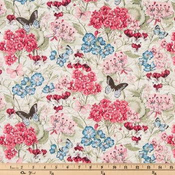 Equip yourself with fantastic fabrics such as Botanical Bouquet Cotton Calico Fabric! This gorgeous fabric features a cream background with beautiful floral designs in pink and blue and small butterflies in black and light blue scattered throughout. Quilt and sew your way to cheery and colorful creation!