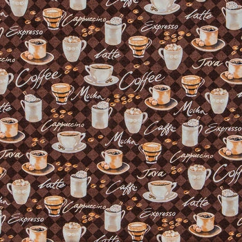 Present your loves and passions through your creative craft projects! Coffee Print Cotton CalicoΒ Fabric features a brown harlequin print beneath a scattered print of coffee-related words and steaming hot coffee mugs and coffee beans. This brown, white, and cream fabric will make super cute and fun-themed accents such as aprons, placemats, fashion accessories, quilts, and more.