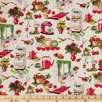 Fill your crafty life and studio with a beautiful fabric fit for any creation you wish! Fifties Kitchen Cotton Calico Fabric features a cream background with 1950s-inspired illustrations like drinks, dustpans, stoves, mixers, and other household accents and items in red, apple green, yellow, and beige. With this fun and colorful fabric on hand, you’ll be on your way to creating fabulous apparel, bags, accessories, and decor.