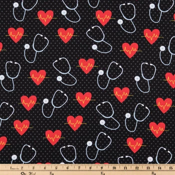Saving lives is your passion, so let your fabric creations reflect your love for people and medicine. First Aid Cotton Fabric features a black background speckled with gray polka dots. Over the top are themed designs of silver stethoscopes and red hearts with a yellow heartbeat running across the center. Enjoy every minute of your free time while crafting unique apparel items, home decor accents, and everything in between, one stitch at a time!