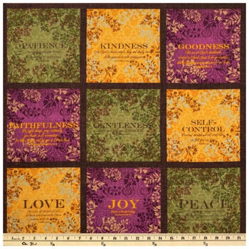Let your sewing skills flourish as you create with Fruit Of The Spirit Panel Cotton Calico Fabric! This panel fabric features square blocks in golden yellow, olive green, and grape purple colors. There are lovely floral and damask backgrounds, one of the Fruits of the Spirit, andΒ a coordinating Bible verse inside of each square. Use it to make a quilt, a wall hanging, a pillow, orΒ other stunning home accentsΒ showcasing your faith.