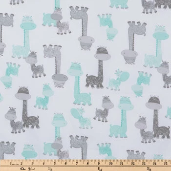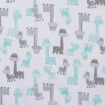 Gigi Packed Giraffe Cotton Calico Fabric boasts a soft, even surface with a white background. The fabric depicts cute, mint and gray cartoon giraffes with floral sketch patterns on their bodies, and the giraffes take a variety of playful poses.