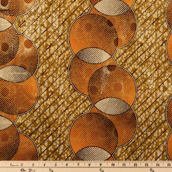 Gold & Orange Metallic Ank Cotton Fabric boasts a matte gold and beige mottled background with diagonal black stripes. All throughout the fabric is a hypnotic pattern of metallic gold dots, and the background is interspersed with intersecting orange and beige circles with a pattern of black dots to offset the gold.