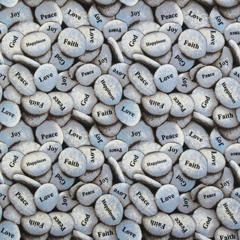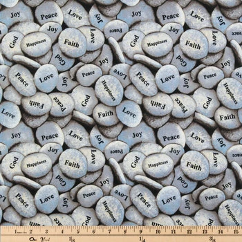 Bring calming over your creations with Gray Peace Pebbles Cotton Calico Fabric! This blue gray fabric features round rocks with inspiring words written in black. With blue and white shading, the pebbles will offer wonderful dimensions to your sewing and craft projects!
