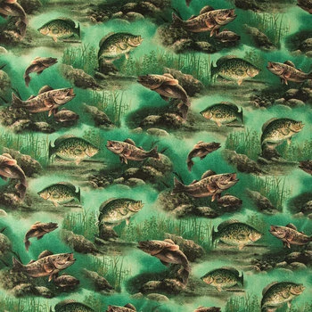 Feature your favorite hobbies through your sewn creations! Hautman Scenic Fish Cotton Calico Fabric boasts swimming fish in a dark green underwater scene with rocks and grasses.