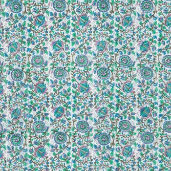 Introduce worldly patterns into your sewing projects, starting with this Kalamkari Print Cotton Fabric! This soft, woven fabric has a white background with a pattern of vines, leaves, and flowers going across it. The blue, green, and pink colors are dyed in a way that slightly bleeds around the lines, giving it an eclectic look. Plus, the flowers have a feather-like motif that gives them an exotic look. Use it for dresses, blouses, and more!