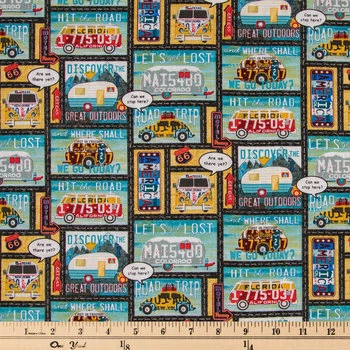Sewing makes you a happy camper, and so does travelling! Use Let’s Get Lost Cotton Calico Fabric to showcase your joy and hobbies. This fun fabric features image blocks with textured, light blue and tan backgrounds with images of campers, VW Beetles, VW Buses, and more.