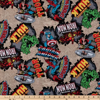 Save your style from destruction and give it excitement instead! Marvel Comic Burst Cotton Calico Fabric features images of Thor, the Incredible Hulk, Captain America, Iron Man, and Spider-Man with gray and black behind them, as well as a light brown comic book layout peeking through in the background. Use it to make bold curtains, pillows, and apparel that are jam-packed with color and action!