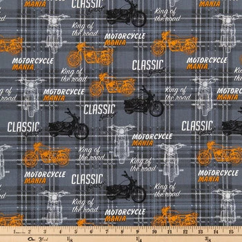 Keep your sewing and craft projects fun with a patterned fabric such as Motorcycle Mania Cotton Calico Fabric! This fabric features a dark gray background with black plaid design and images of motorcycles in orange, white, and black along with phrases about the road. Make blankets, scarves, and so much more, showing off your personality and passions!