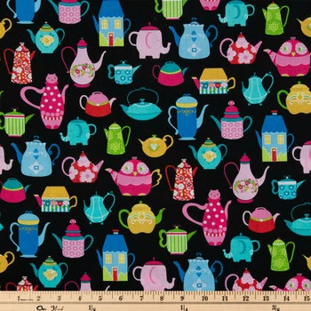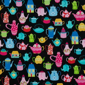 Get your creativity juices boiling with Novelty Tea Pots Cotton Calico Fabric! It adorable fabric offers a black background with brightly colored tea pots of pink, turquoise, yellow, blue, and red. Each teapot is unique in style, pattern, and color. This cute and colorful fabric is ideal for kitchen and dining accents such as aprons, towels, table runners, and themed apparel.