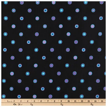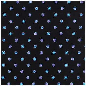 Enhance your sewn creations with intriguing and eye-catching patterns like the one found on this Peacock Polka Dots Cotton Calico Fabric. This lightweight cotton fabric features a repeating pattern of light blue, blue, light purple, and dark purple polka dots on a black background. The colors are arranged in a variety of ways within each dot and resemble the ocelli that are found on a peacock feather. Use it for apparel, accessories, home decor, and more.