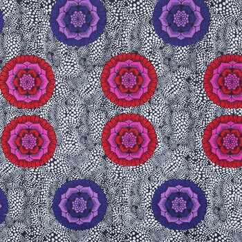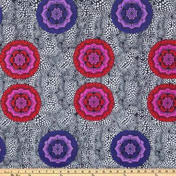 Add a worldly look to your wardrobe when you sew with this Pink & Purple Speckled Floral Cotton Fabric! This woven cotton fabric has a black and white speckled background. On top of that, there are rounded flowers in rows of purple and red colors. Use this lovely fabric for wraps, scarves, and more!