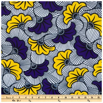 Bring the beauty of world cultures to your sewn crafts, starting with the Purple & Yellow Ginkgo Batik Fabric. This bold material boasts a fusion of traditional African patterning styles with the East Asian ginkgo leaf design. Thick, dark lines form a fanning striped pattern between bright yellow and dark purple ginkgo leaves. Use this with your sewing machine to create eye-catching attire!