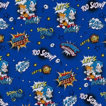 Find the perfect material and pattern before you get to work! Sonic & Tails Cotton Calico Fabric features a dark blue background color, and there are repeating patterns of Sonic The Hedgehog and Tails. There are also text designs in white, blue, red, and yellow, as well as black stars. Use this fabric for bags, aprons, and more!