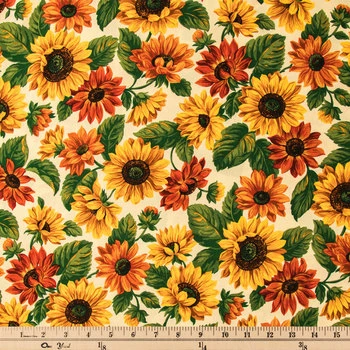Fill your crafty life and studio with a beautiful fabric fit for any creation you wish! Sunflower Cotton Calico Fabric features bright, gorgeous sunflowers in orange and yellow color with vibrant green leaves and a cream background. This bold fabric will have you on your way to creating cheery apparel, table runners, placemats, bags, accessories, decor, and so much more!